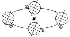 (2)地球处于①位置时,为北半球的________日(二分、二至日),此日太阳直射的纬线是________。该日后,太阳直射点将向______(方向)移动。