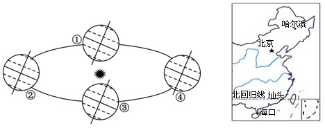 (4)地球由②向③位置运行过程中,北京的正午太阳高度将逐渐________(增大或降低),北京白昼的变化规律是_____________________。