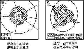 本题解析:考查学生对城市几种功能用地与距市中心距离的内在联系的理解和读图、用图的能力。由于商业区的区位需求是要有便捷的交通和大量的消费人口,因而甲、乙两图的市中心均为商业区;在乙图的市中心附近,出现住宅区,主要是由于这些地区交通通达度较差,地租较低。
