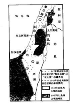 4、综合题 读阿以冲突示意图,完成下列要求:(11分)