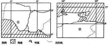 小题1:根据经纬度位置和海陆轮廓判断。①国濒临海域位于东半球(4°E经线穿过),北半球(4°N纬线穿过),应为几内亚湾;②国濒临海域位于西半球(60°W经线穿过),北半球(12°N纬线穿过),应为加勒比海。