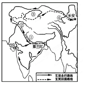 5、单选题 中国唐代高僧玄奘于627年(唐太宗贞观元年)8月从长安出发,长途跋涉5万余里,到达天竺国北部佛教最高学府那兰陀寺受学。后来,又游学天竺各地。645年2月(唐贞观十九年正月)回到长安。据此读“玄奘西天取经路线图”,回答下列问题。