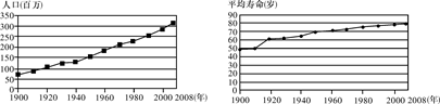 材料一 美国人口增长示意图。 材料二 美国人均寿命变化示意图。