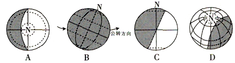 (2)下列光照图(斜线部分表示黑夜)所示日期与上图中一致的是(   )