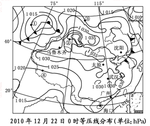 2、填空题 图为“2010年12月22日0时海平面等压线分布图”,读图回答下列各小题。(6分)