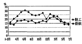 4、单选题 读“2010年1月至2011年7月中国轻工和纺织行业出口交货值分月增速图(下图)”,完成下列问题。