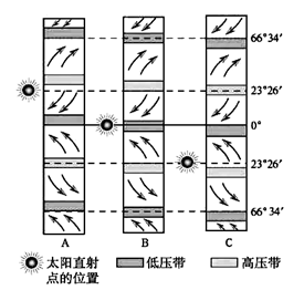 本题解析:根据图中太阳直射点所在的纬度位置不难断定出图中A B C 分别所代表的时间是北半球的夏至日、春(秋)分日、冬至日,根据必修1的第一单元中的相关内容,可知当太阳直射点如A图所示时(北半球的夏至日),北京是昼最长,夜最短的夏季,气候上表现为高温多雨的特征。故选C
