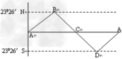 1、单选题 下图中外圆表示纬度圈,N为北极点。若BAD弧表示昼弧,则C点的日出时刻是