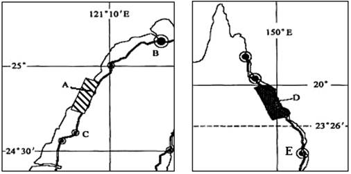 (2)小,原因是:1月份直射点在南半球,D区域的正午太阳高度和昼长都比A区域大,所以温度高;A区域容易受到来自大陆的冷的西北季风影响,所以温度低;D区域附近沿岸有暖流经过,能起到增温的作用