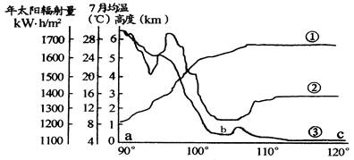 小题1:沿30°N自西向东地势逐渐降低,沿海地区海拔在10米左右,③为地势曲线。由于西部地势高,所以西部7月气温较低①为7月均温曲线。东部降水多,太阳辐射少,四川盆地地形封闭,水汽多,太阳辐射更少,所以②是年太阳辐射量曲线。?