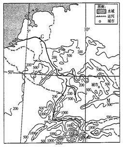 | G | ? | ? 参考答案:(1)夏?高山冰雪融水 本题解析:本题考查莱茵河及其支流的相关内容。第(1)题,由经纬度可确定图中河流为莱茵河。根据E河段的径流量变化曲线,可知其汛期出现在夏季,但其夏季降水较少,说明降水不是该河段的主要补给方式,根据其所处地区的海拔高度,可知高山冰雪融水补给为其主要的补给形式。第(2)题,从径流变化曲线中可以看出河流不同支流的汛期不同,使得下游河段的径流不致出现过大变化,有利于防洪。第(3)题,运河应位于两河流距离最短,且沿等高线分布,地形起伏较小。第(4)题,流域的自然背景决定了其利用方式和开发方向,解答时一定要结合不同河段所处的地理位置以及图中的相关图例进行分析。 本题难度:一般 |