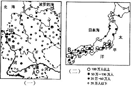 3、综合题 图(一)、图(二)分别为“德国和日本不同等级城市分布图”。读图回答下列问题。