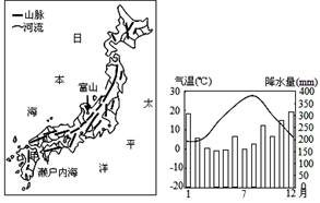 1、单选题 读日本山河分布示意图及富山市气温和降水季节分布示意图,读图完成下列各题。