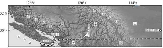 3、综合题 (28分)加拿大地广人稀,西南部地区地形复杂,欧肯那根河谷是世界著名的冰酒产地。根据加拿大西南部某地区示意图(下图),结合所学知识,完成问题。