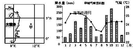 小题1:根据经纬度判断,甲城位于非洲赤道附近大西洋沿岸,从气候资料分析,该处终年高温,降水丰富。应为热带雨林气候。故选A。