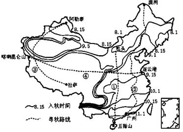 1.我国各地入秋时间的序列是:2.影响路线③的入秋时间序列的原因3.图中所示区域的寻秋路线数码代号与景观描述连线正确的