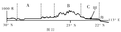 4、综合题 图22是我国沿113°E的地形剖面图,读图回答。