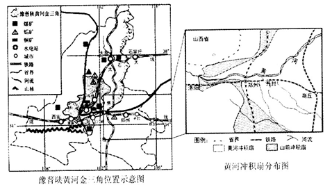 材料二?豫晋陕黄河金三角位置示意图、黄河冲积扇分布图。