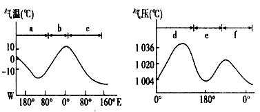 1、单选题 读“沿60°N纬线所作的某月平均气温和气压水平分布变化示意图”。
