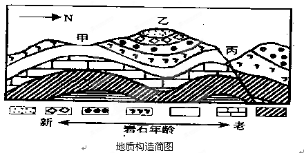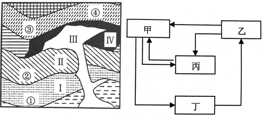 5、单选题 下图为某区域地质剖面示意图、右图为地壳物质循环示意简图,读图回答下列问题。