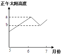 1、单选题 右图为某地5~7月份正午太阳高度角的变化示意图。读图回答下列小题。