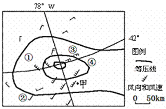 【小题2】材料中说该天气系统正以每小时50km的速度向东南方向移动,4小时后,甲地位于该天气系统的西北方向,受南下冷空气影响,气温下降,A、B错。等压线更稀疏,风速减小,D错, C正确。