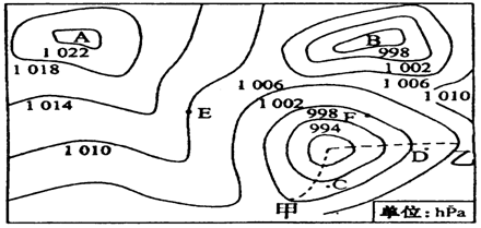 (2)图中甲乙两处形成的锋分别为__________ 、___________,我国冬季爆发的寒潮是_______(甲、乙)所示的天气系统南下形成的灾害性天气;图中C、D两处中将要出现阴雨天气的是_________ ;乙天气系统过境时的气温变化状况是_________________。(5分)
