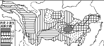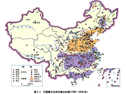 1、综合题 读“中国重大自然灾害点位图(1990~2000年)”,完成下列各题。