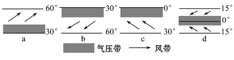 【小题3】当沈阳白昼时间最短时,下图所示气压带、风带分布正确的是( )