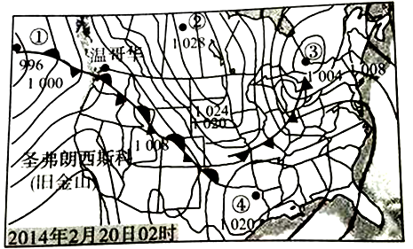 【小题1】由题中可知,此时是2月20日,从等压线图可以看出,此时受北方冷气团的影响,在北美大陆形成了高气压,是冷锋天气系统,伊利湖附近此时是低气压,没有暴风雪;弗朗西斯科受暖锋的影响,气温是上升的;墨西哥湾沿岸此时是受离岸风影响;温哥华经历了连续性降雪,故选C.