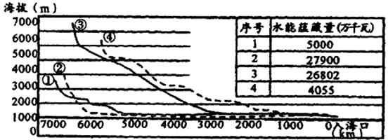 4、单选题 下图是“长江、黄河、尼罗河和亚马孙河的干流剖面图及流域内水能蕴藏量表”,读图回答下列各题。