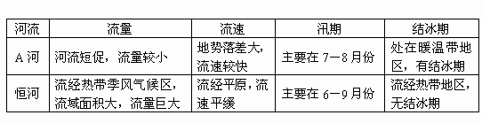 (2)简要比较朝鲜半岛的A河流和印度半岛的恒河水文特征的主要差异。(12分)