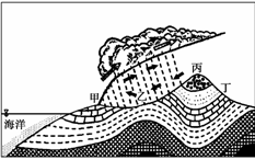 4、单选题  图甲是某同学去广西旅游时绘制的地貌素描图;图乙为地壳物质循环示意图,甲、乙、丙、丁为沉积物、岩浆岩、沉积岩、变质岩,①②③④表示地质作用。读图,完成下列问题。