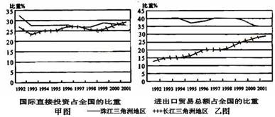 小题1:国际直接投资和进出口贸易总额占全国的比重:珠江三角洲地区呈下降趋势;长江三角洲地区不断上升,在2000年后国际直接投资比重超过珠江三角洲地区