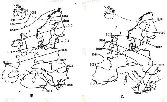(1)表示欧洲西部7月份等压线分布的是 (填甲或乙) 图。