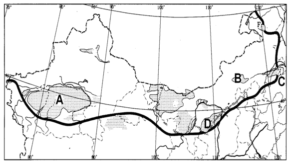 (3)图中A—D四地中位于西北温带及暖温带荒漠区的是__________。(2分)