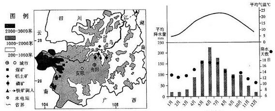 材料一?贵州地形与主要矿产资源分布示意图(图1)、贵阳气候基本数据统计图(图2)