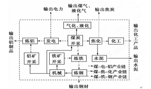 (3)山西省结合本区的?、?等资源优势,围绕?开发,构建了三条产业链,其中输出钢材的是_______________________?产业链。(3分)