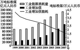 3、单选题 下图为“1999~2007年中国工业能源消耗量、工业增加值及能耗图”。读图,完成小题。