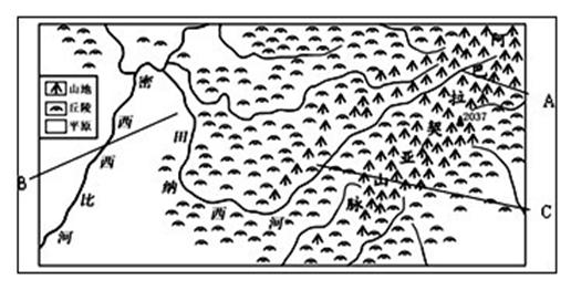(2)在A、B、C三处中,人类活动的比较集中地区是_____ (填字母),该处的地形是_______________。