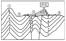 3、单选题 下图为某地地质剖面图,图中1、2、3、4、5、6为地层编号,表示地层由老到新。据此判断1—2题。