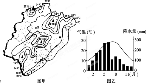 材料二 图甲为福建省7月气温分布图,图乙为图甲中B地年内各月气温和降水量分布图。