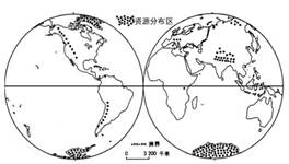 3、单选题 自然资源是人类生存和发展的物质条件。图中黑点所在地是世界某种资源的主要分布区,读图回答问题。