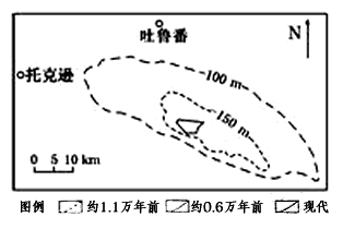 2、单选题 艾丁湖的存在对吐鲁番盆地绿洲的维持具有重要作用。读l万多年来艾丁湖变迁示意图,回答1—2题。