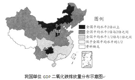 (1)下图中甲省的单位GDP二氧化碳排放量高于全国平均水平,为什么?请列举两条