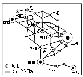4、单选题 下图为“长江三角洲城镇空间体系”示意图,符号大小表示城市等级的高低。读图完成下列问题。