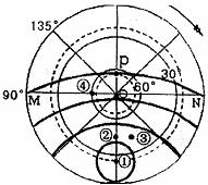 2、单选题 下图为地球某时刻太阳高度分布示意图,图中粗线为等太阳高度线。据此回答下面几题。