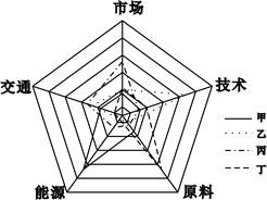 1.如果a、b、c分别代表影响工业区位的原料因素、能源因素、市场因素,则下列最能代表炼铝工业的点是2.如果a、b、c分别代表科研费用、能源费用、原料费用所占的比重,则能表示高科技产业的点是: