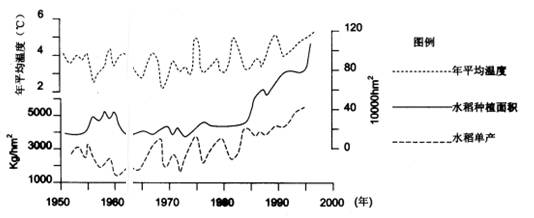 材料2:“1951一1997年该地区年平均温度、水稻种植面积及单产的变化图”