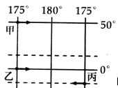 5、单选题 读图,据此回答下列各题。1.甲、乙、丙三艘轮船同时沿图示方向以相同的速度驶向180°经线,则下列说法正确的是2.有关叙述不正确的是3.甲和丙比较